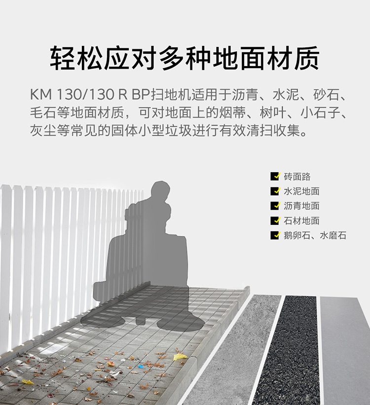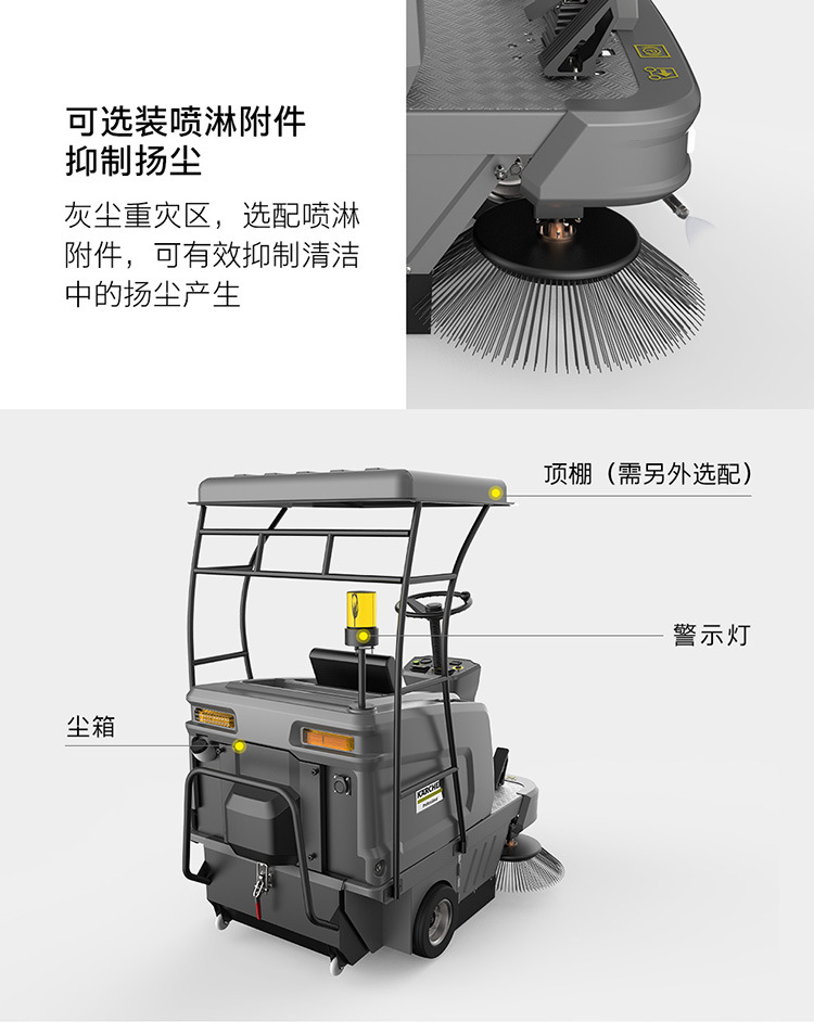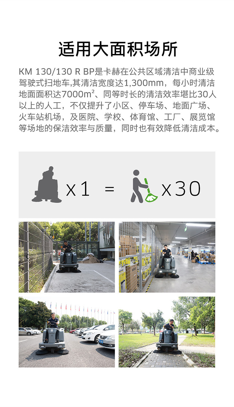 卡赫高品質(zhì)商業(yè)級駕駛式掃地車,清潔寬度1,300mm,每小時可高效清潔7,000㎡以上的地面,告別傳統(tǒng),有效替代30人以上的人工,可有效清潔瀝青,水泥,砂石,毛石等洗地機(jī)無法清洗的地面。